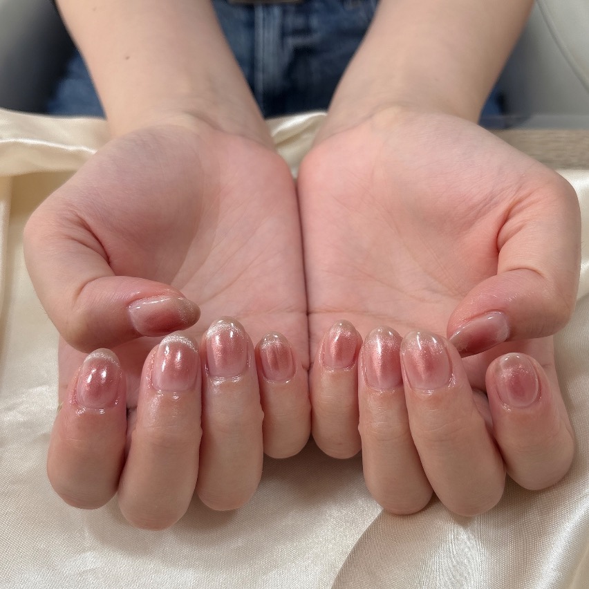 チークマグネットネイルのベースは、パステルカラーのジェルなので、伸びても目立ちにくいです。