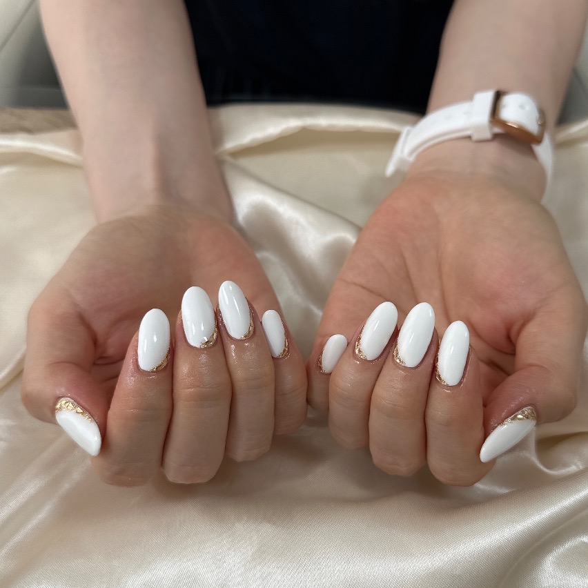 「白フレンチは好きだけど、ちょっとだけ華やかさも欲しい」 そんな声に応えているのが、このゴールドアクセントの白フレンチです。