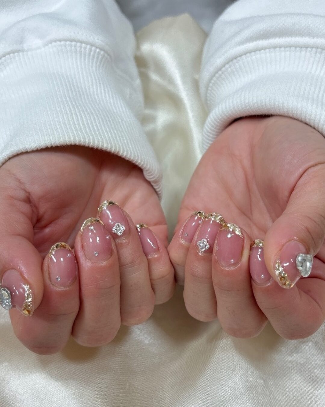 ガラスフレンチだけでも十分華やかですが、さらに大きめのストーンやハートのパーツを添えることで、よりジュエリー感の強い仕上がりにすることができます。