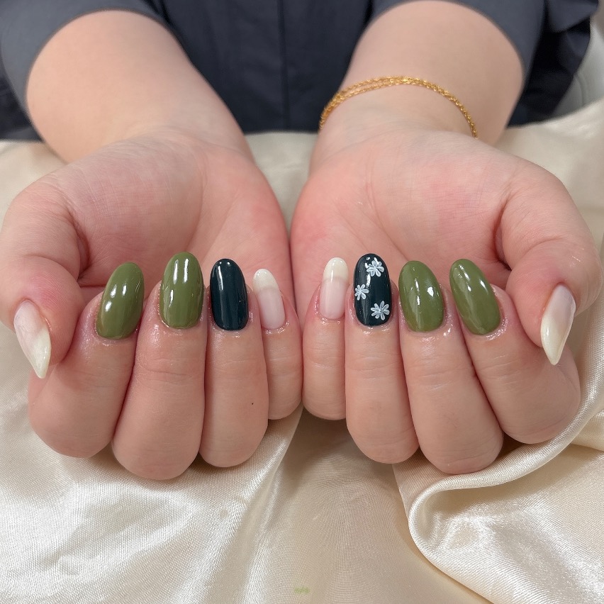 落ち着いたトーンがお好みの方には、オリーブグリーンを。手描きのフラワーが、シックな中に春の可愛らしさをプラスしてくれます。