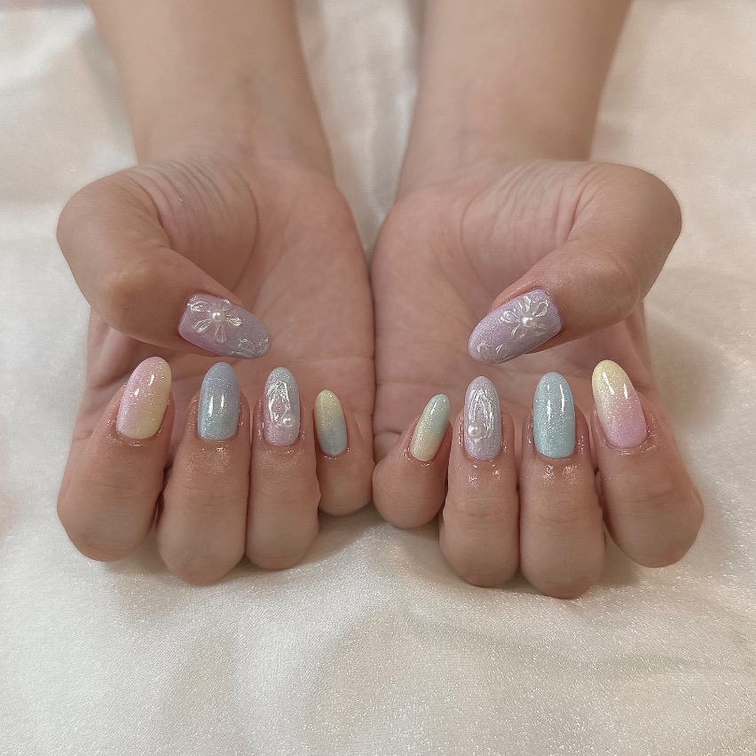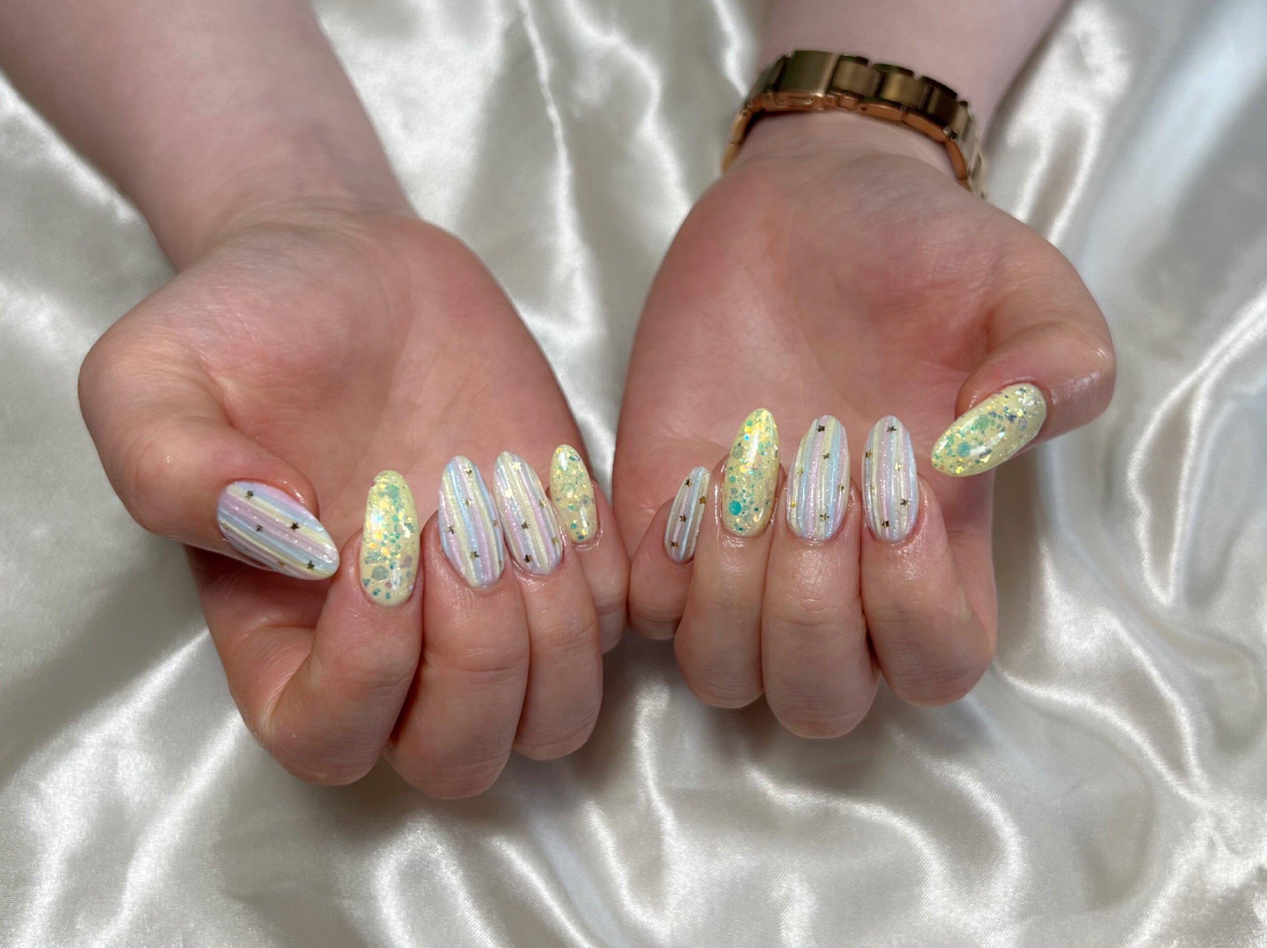 トレンドの「ぷっくりフラワー」に、イエローのラメを合わせて。まるで春の花びらが舞っているような華やかさです。