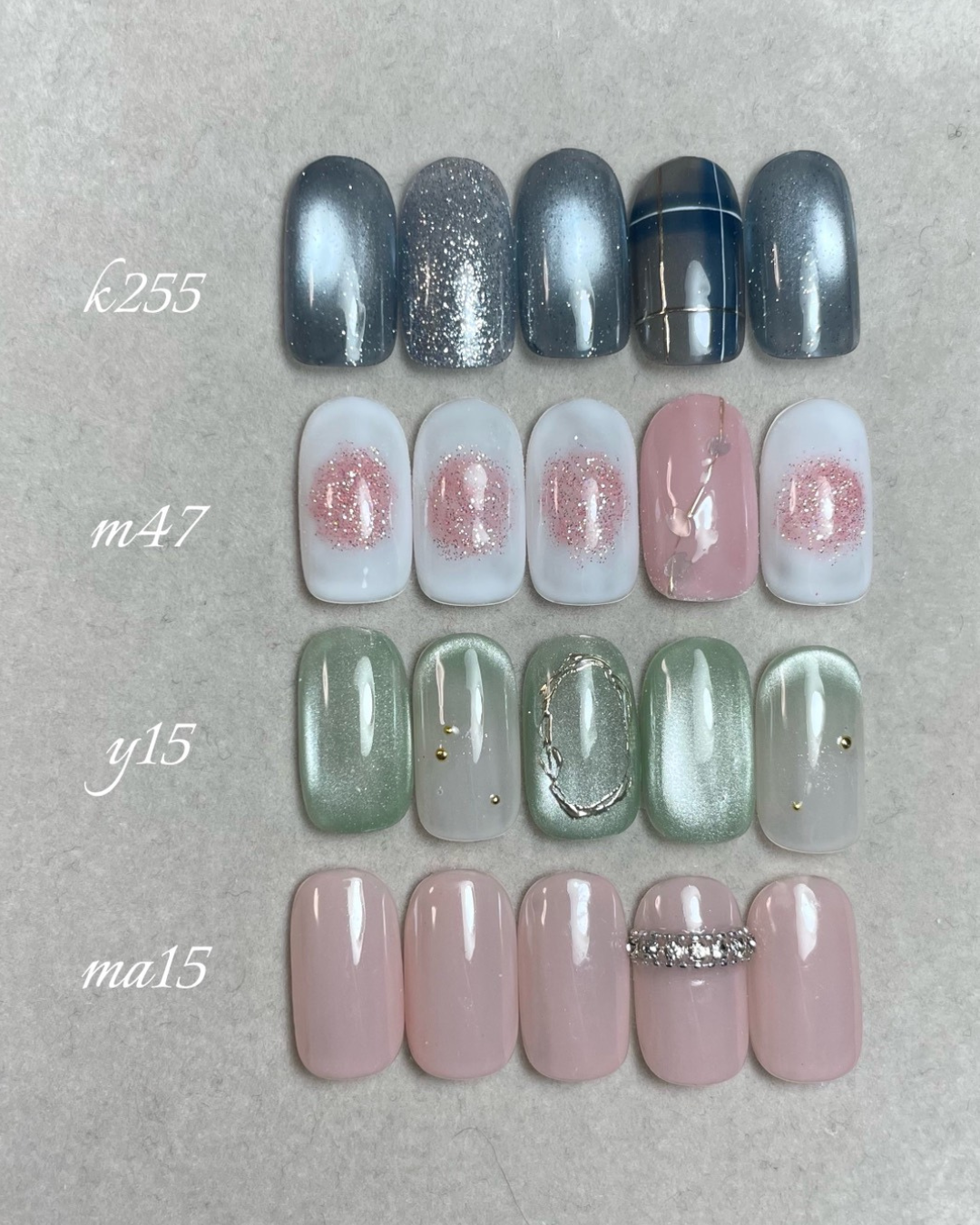 洗練されたブルーグレーをベースに、きらめくグリッターと繊細なチェック柄を合わせました。甘すぎないクールでスタイリッシュな手元を演出したい方におすすめです。 - m47(ふんわり春色チーク&ニュアンス)