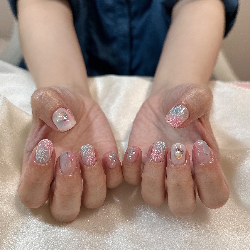 水色とピンクを使った花火デザインで、夏の夜空を指先に!