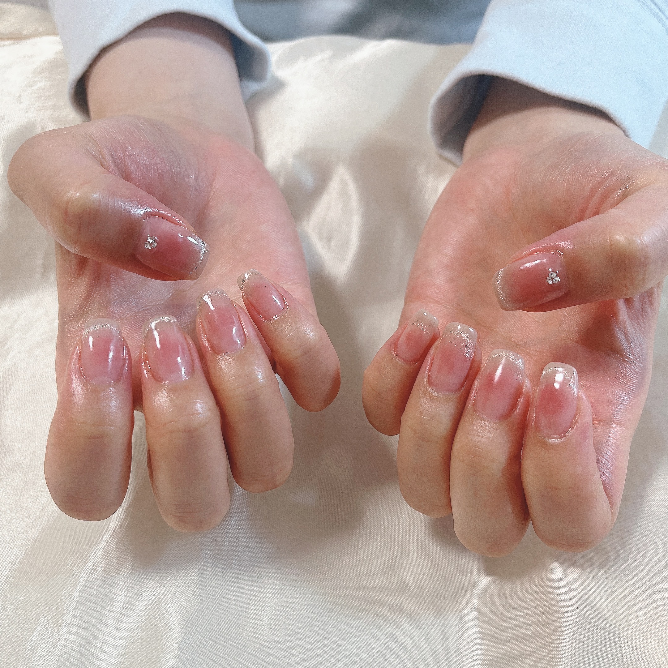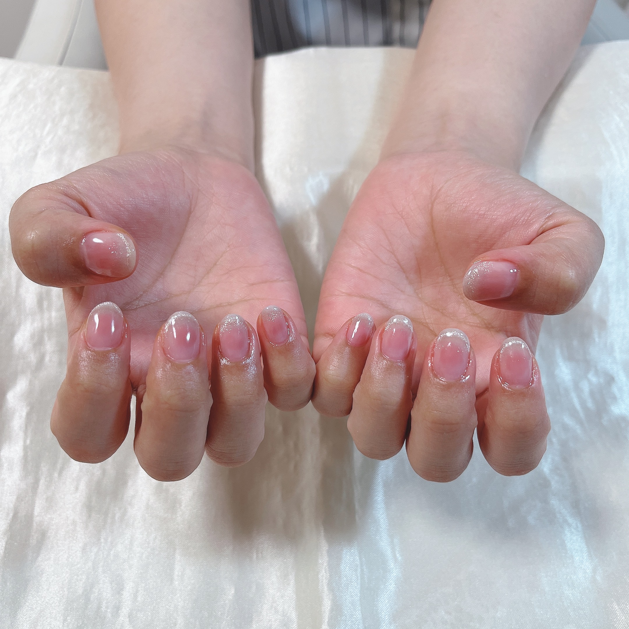 ほんのり色づいたチークカラーに、爪先へ向かってラメを散らしたフレンチ風の仕上がりが、上品でかわいいと評判です。