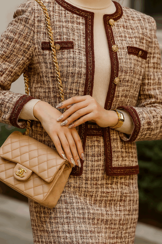 そんな上品な装いに、あえて“派手”なツイードネイルを合わせるのが今のファッション。