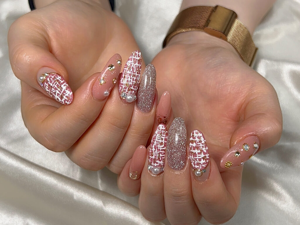 ピンク×ホワイトの織り柄に、ラメ、パール、ストーンを贅沢に散りばめた指先は、まるでジュエリーのよう。